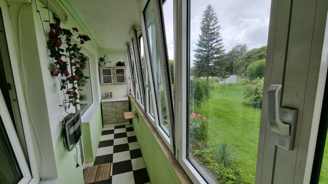 • Erdvus, įstiklintas balkonas, per du kambarius